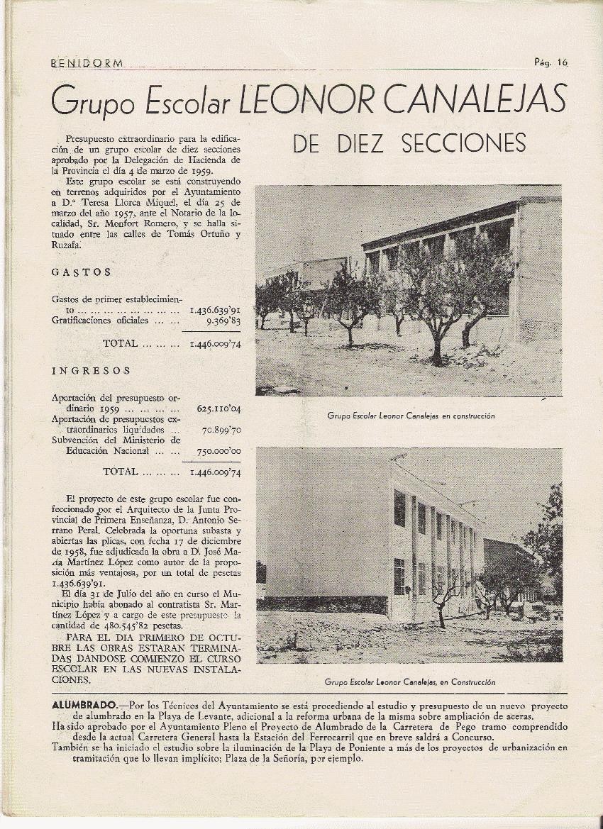 El Grup Escolar Leonor Canalejas, conegut com el grupo, porta el nom de qui va ser donant de la casa coneguda com de Cazorla i fins l’any 2003 seu de l’Ajuntament de Benidorm. En 1958, quan ja era impossible atendre les necessitats escolars amb condicions mínimes, l’Ajuntament compra uns terrenys entre els carrers de Tomás Ortuño i Russafa destinat a un grupo escolar de diez secciones. El projecte estava redactat des del mateix any 58 per l’arquitecte de la delegació de Primera Ensenyança, Antonio Serrano Pelar, i l’obra s’adjudica per subhasta al constructor José Maria Martínez López perquè era la proposta més barata. Fou inaugurat el dia 3 de febrer de 1960 a les 6 de la vesprada (el mateix dia que les escoles de la Fundació Zaragoza Fuster de l’Almafrà ). Poc duraria la felicitat: sobtadament, el 26 d’Agost d’aquest any 60, segons l’acta municipal… a las siete horas del dia de hoy se ha producido un derrumbamiento en la cubierta de una de las alas del grupo escolar Leonor Canalejas de esta localidad, recientemente inaugurado y cuyas obras aun no han sido recibidas definitivamente. La caiguda de part de l’edifici no va tindre, per sort, conseqüències tràgiques, tot i que podria haver estat una desgràcia d’un abast incalculable.
