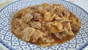 Elaboració: Utilitzarem el caldo d’haver bullit carn de caça: perdiu, llebre, etc. Si no se’n té, sempre hi ha alternatives. En paella gaspatxera, fonda i amb anses, sofregim la nyora, els alls i la tomaca, per a picar després en el morter amb el julivert i el safrà. En el mateix oli daurem el conill, trossejat però deixant senceres cuixes, potes i costelles. Repartim generosament timonet i romer que contribuiran a donar-li el toc de caça. Quan comence a soltar-se la carn de l’os estarà al seu punt i reservarem. En una font tindrem ratllades les cebes i trossejada en trossos molt menuts la pebrera verda. Ho sofregirem tot lentament durant 1 hora, tapant la paella perquè es faça blanet fins quasi desaparéixer. Quan estiga al seu punt incorporem la salsa del morter remenant-ho tot durant 10 minuts més. Afegim ara el caldo procurant que alce el bull a poc a poc i repartim la pasta de gaspatxo amb compte perquè no s’apegue. Finalment, repartim per igual la carn i deixem bullir 20 minuts, sacsant la paella de tant en tant. Deixem reposar 1/4 d’hora. Hi ha qui posa caragols, esclata-sangs, etc. com també són variades les formes de servir-se. Sal al gust.