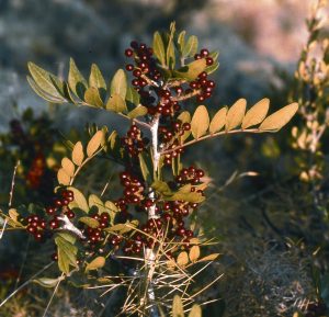 (Pistacia lentiscus, família de les anacardiàcies) És una mata o arbust perenne baix que pot arribar a desenvolupar se com un arbre. Creix en colls i vessants de la terra baixa, tant a la costa, al costat de garrofers i margallons, com a l’interior, al costat de la carrasca. L’escorça de les branques joves té un color rogenc que més tard es torna gris. Les fulles no tenen pèls, són senceres i es composen de tres a sis parells de folíols de forma lenticular; vistes a contrallum es veu en les vores un ribet clar i en el mig es transparenta la vena principal. D’aquesta mata hi ha peus masculins i peus femenins; els masculins fan uns ramellets curts de flors amb el calze dividit en cinc lòbuls, sense pètals i amb cinc estams rojos; els femenins tenen el calze dividit amb tres o quatre lòbuls amb un pistil arrodonit que es convertirà en un fruit com un pésol, primer verd, després roig i finalment negre. La resina s’utilitza en la indústria dels vernisos. Sol aparéixer a tots els terrenys naturals del municipi.