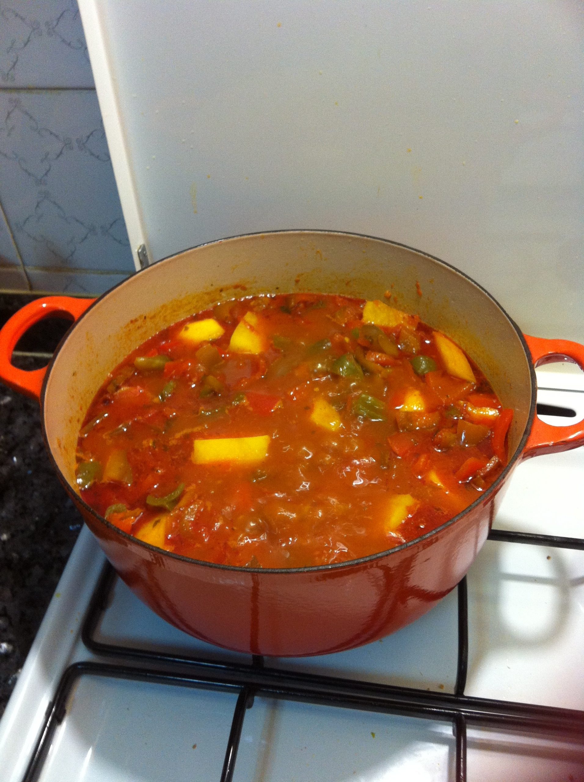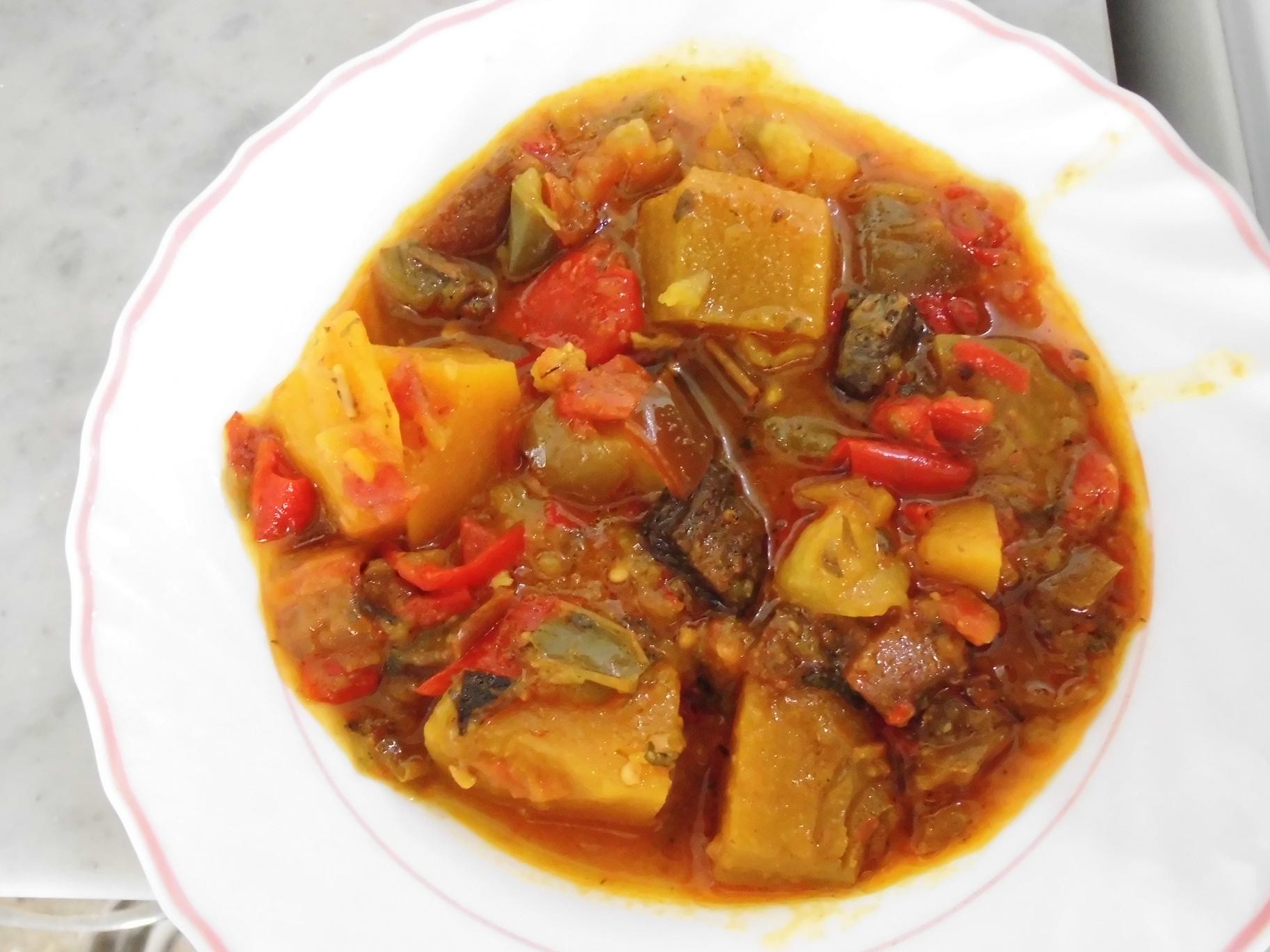 Elaboració: La nit anterior posem a remulla el sangatxo o tonyina de sorra, canviant-li l’aigua 3 vegades. En una cassola de ferro torrem la nyora, les ametles, els alls, el pa i la tomaca per a resevar en el morter i picar amb julivert. Daurem la carabassa, que haurem tallat a daus, sense llevar-li la pell i ben llavada. Afegim el sangatxo ben escorregut, i la pebrera, que haurem tallat en trossos xicotets. Sofregim lentament durant 1/2 hora fins que estiga al punt i incorporem la salsa del morter. Utilitzarem espàtula o cullera de fusta per anar movent els ingredients. Finalment, aboquem aigua solament per a cobrir-ho. Hi ha qui li posa algunes gotetes de licor o un poc de creïlla quan el plat es fa amb tonyina de sorra. Molta imaginació i poca sal.